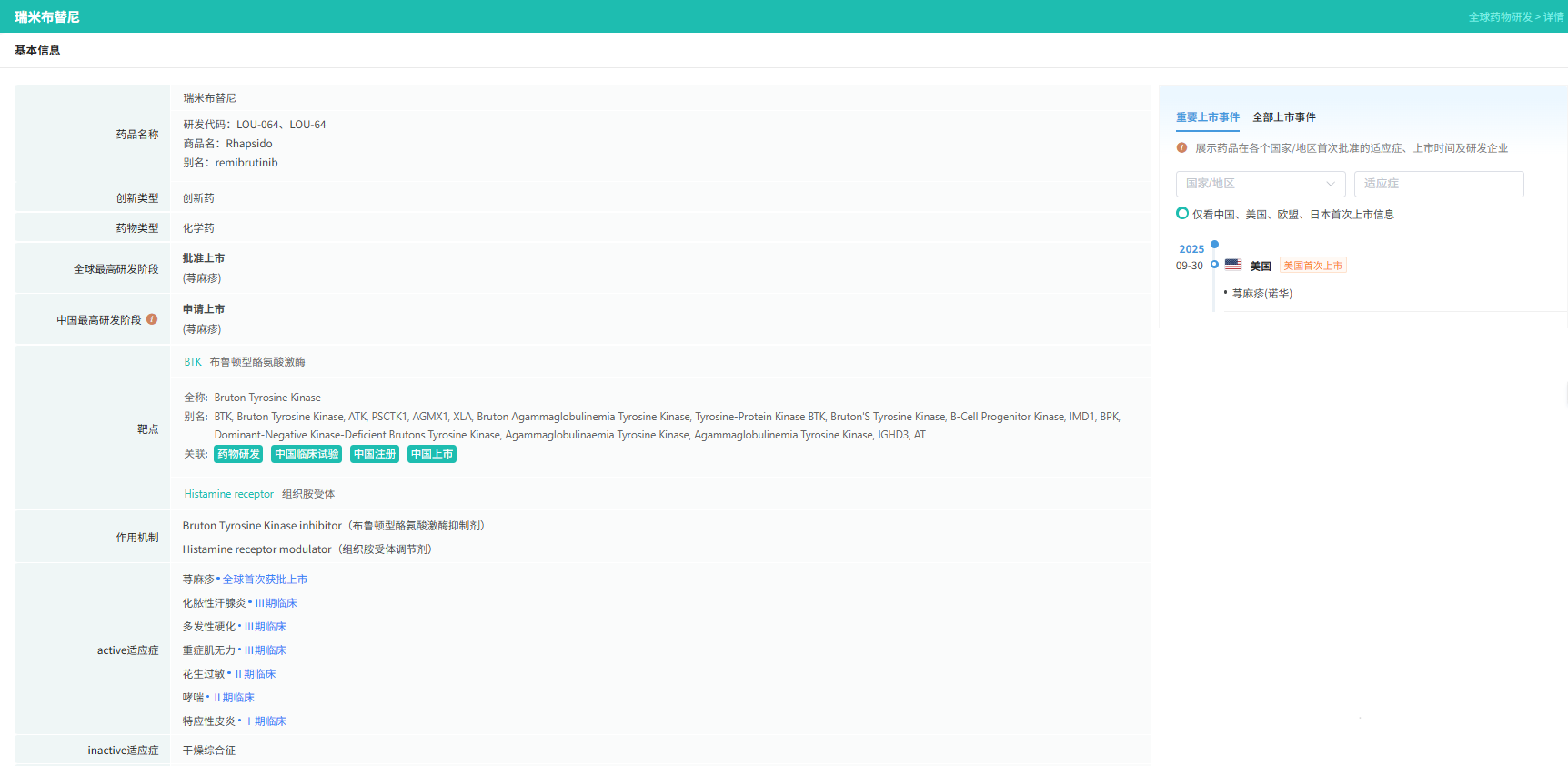 据摩熵医药数据库显示,瑞米布替尼片是一种高选择性共价结合BTK抑制剂,可阻断BTK级联反应并抑制导致瘙痒性风团和肿胀的组胺及其他介质释放。其在临床研究中表现出的快速起效,以及长期的疗效和安全性,使得瑞米布替尼片有望成为新一代CSU治疗选择之一。此外,作为一款口服靶向药,瑞米布替尼片便于使用,有利于提升患者治疗依从性和疾病管理。