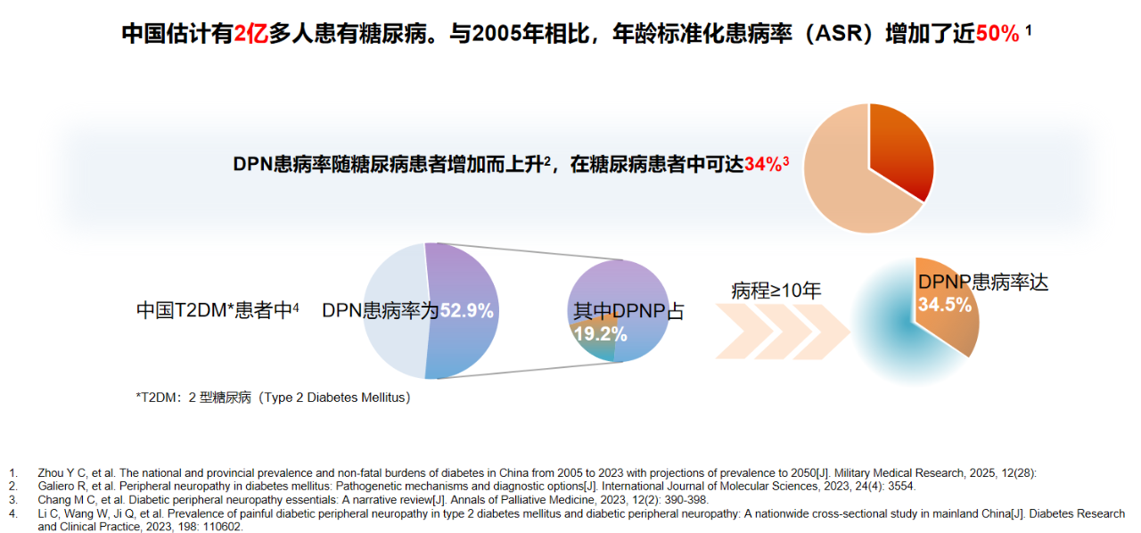 我国糖尿病患者已超2亿,其中2型糖尿病患者中糖尿病周围神经病变(DPN)患病率高达52.9%,而DPNP作为最痛苦的并发症之一,占后者比例达19.2%,病程超10年的患者患病率更是升至34.5%。DPNP给患者带来持续性折磨,据一项可靠调查,高达66%的患者因痛残疾,44%的患者认为疼痛导致衰老,约30%的患者日常活动受严重干扰,需要长期服用助眠药,生活质量大打折扣。