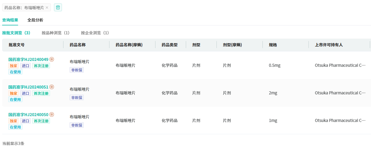 2024年6月,原研药正式进入中国市场,获批适应症为成人及青少年精神分裂症。然而,原研药上市至今未被纳入国家医保目录,且其国内上市规格(0.5mg/1mg/2mg)中未包含4mg规格,为后续仿制药企业留下市场空白。