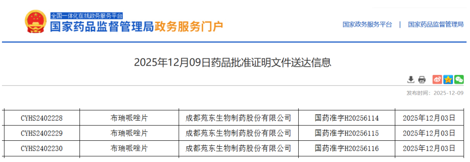 12月9日,据NMPA官网显示,成都苑东生物制药申报的 布瑞哌唑片(化药4类)获批上市并视同通过一致性评价,成为国内首仿企业。