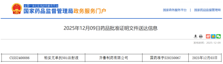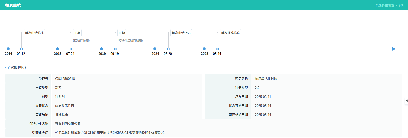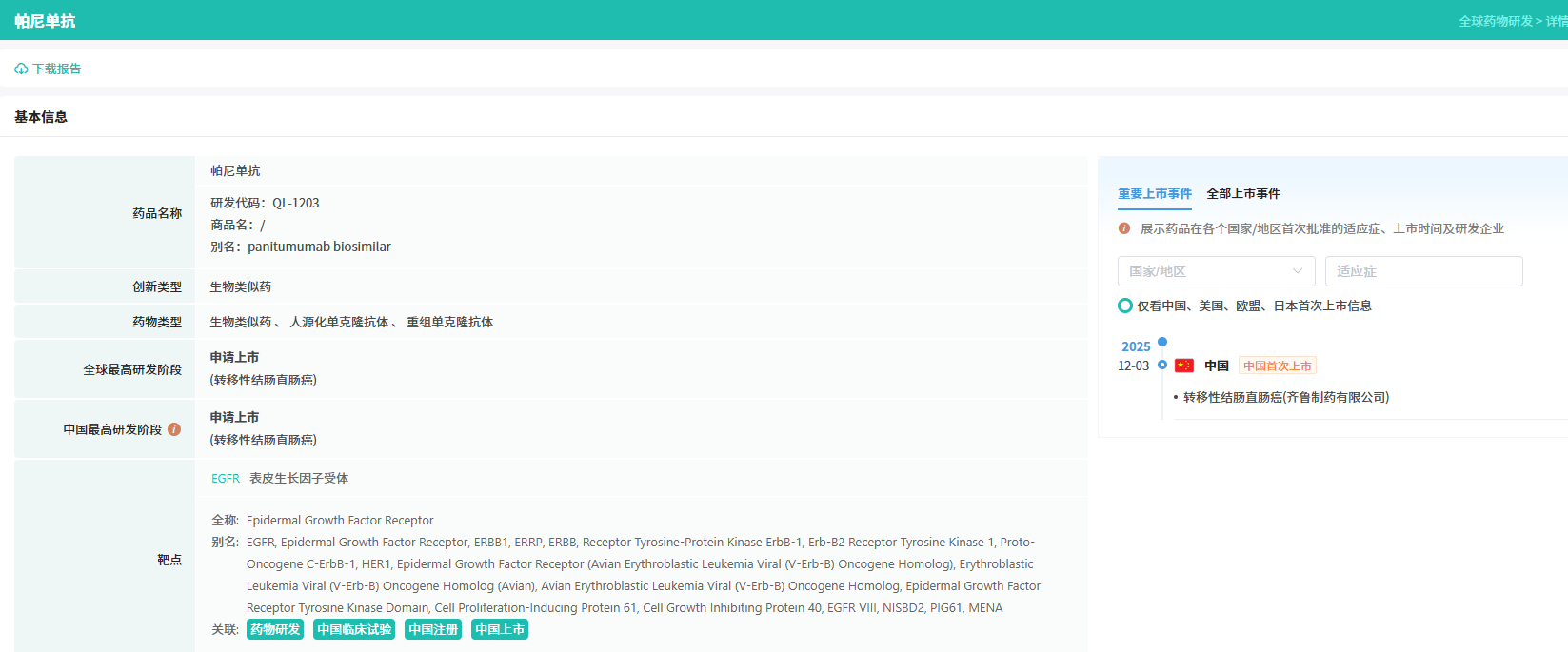 近日,据NMPA官网显示,齐鲁制药自主研发的帕妥尤单抗 N01注射液(QL1203)成功获批上市。该药物作为国内首款全人源抗EGFR单克隆抗体3.4类新药,将联合mFOLFOX方案,用于RAS野生型转移性结直肠癌(mCRC)患者的一线治疗。