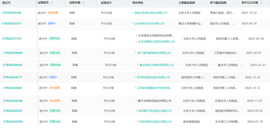 司美格鲁肽的核心专利将于2026年3月到期,未来将面临着激烈的竞争。目前国内已有10款国产司美格鲁肽申报上市,分别来自正大天晴、石药集团、复星万邦、倍特药业、惠升生物、中美华东、联邦制药、九源基因、丽珠集团、齐鲁制药。