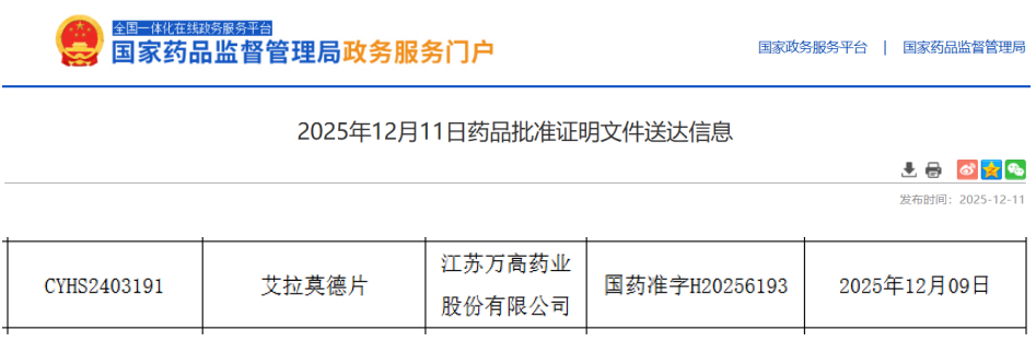 12月11日,据NMPA官网显示,江苏万高药业以仿制4类申报的艾拉莫德片正式获批上市,并通过一致性评价。截至目前,这是江苏万高获批的第6款抗炎抗风湿药,此进展既标志着江苏万高在抗风湿领域取得新突破,又为国内类风湿关节炎患者增添治疗新选择。