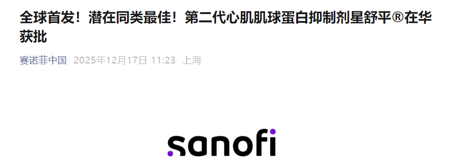 12月17日,赛诺菲(Sanofi)宣布,第二代心肌肌球蛋白抑制剂(CMI)阿夫凯泰片正式获得中国国家药品监督管理局(NMPA)批准,用于治疗纽约心脏协会(NYHA)心功能分级II-III级的梗阻性肥厚型心肌病(HCM)成人患者,以改善运动能力和症状。