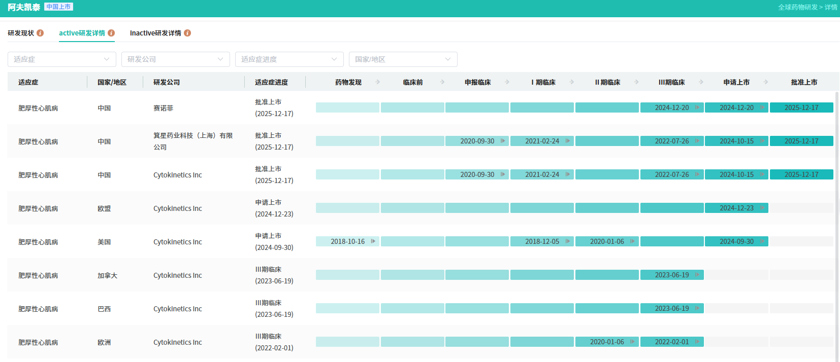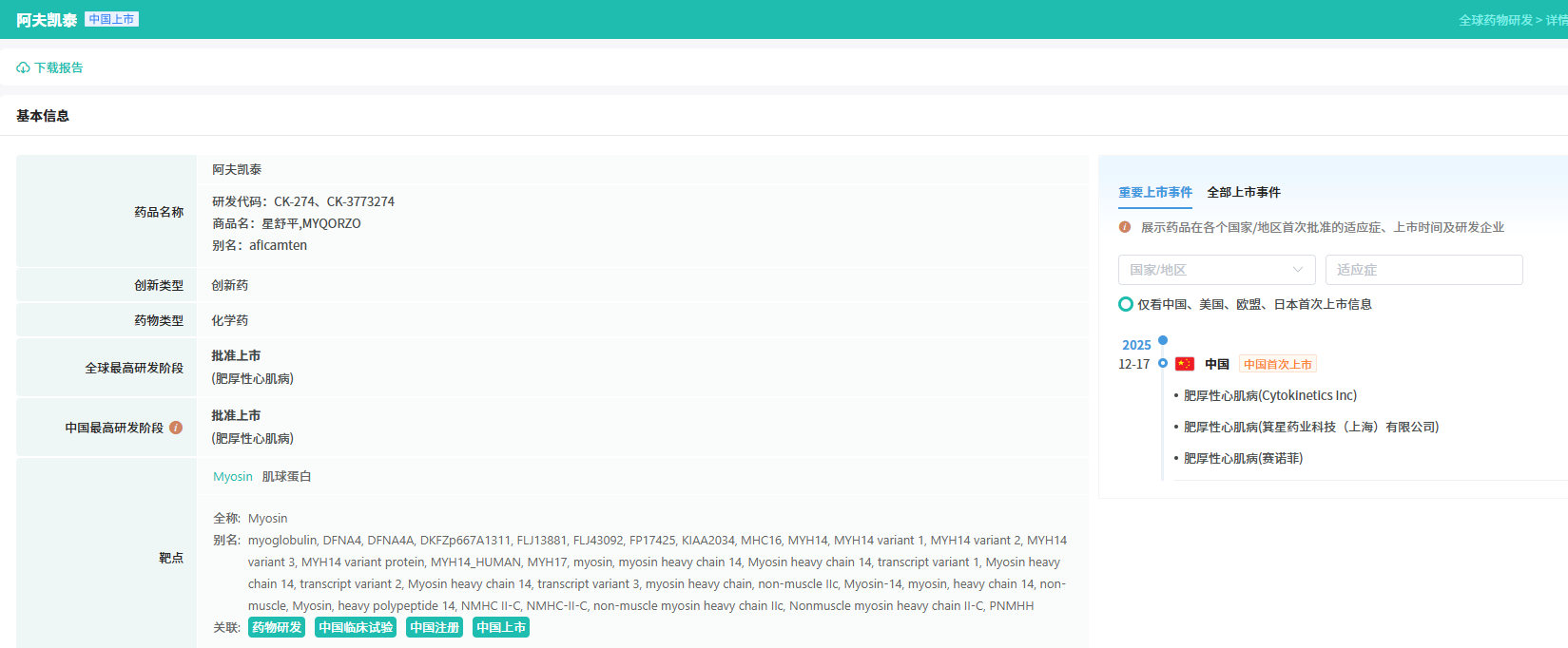 阿夫凯泰片是肥厚型心肌病领域潜在“同类最佳”的治疗药物,作为第二代心肌肌球蛋白抑制剂,阿夫凯泰片能够精准靶向心肌肌球蛋白,直接抑制产力横桥的形成,减轻心肌过度收缩。此次获批标志着阿夫凯泰片是在中国实现“全球首发”的创新药,据摩熵医药数据库显示,阿夫凯泰片中国获批早于美欧等全球其他地区,2025年12月7日,国内箕星药业上海公司获批,用于肥厚性心肌病。