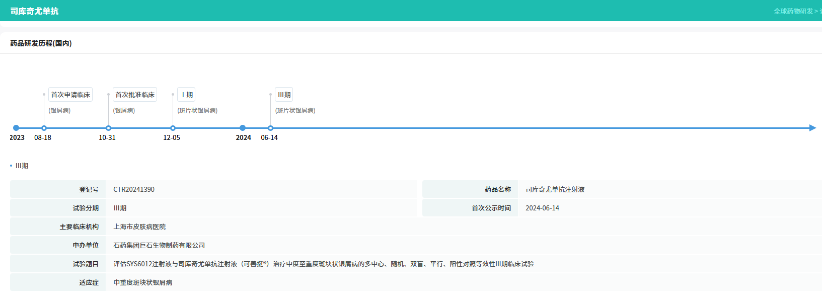 石药集团开发的 SYS6012 是一款全人源IgG1单克隆抗体药物,为司库奇尤单抗注射液(可善挺®)的生物类似药。石药集团根据生物类似药的研究指导原则开展 SYS6012 的研发,并与 可善挺® 进行了头对头等效性研究。