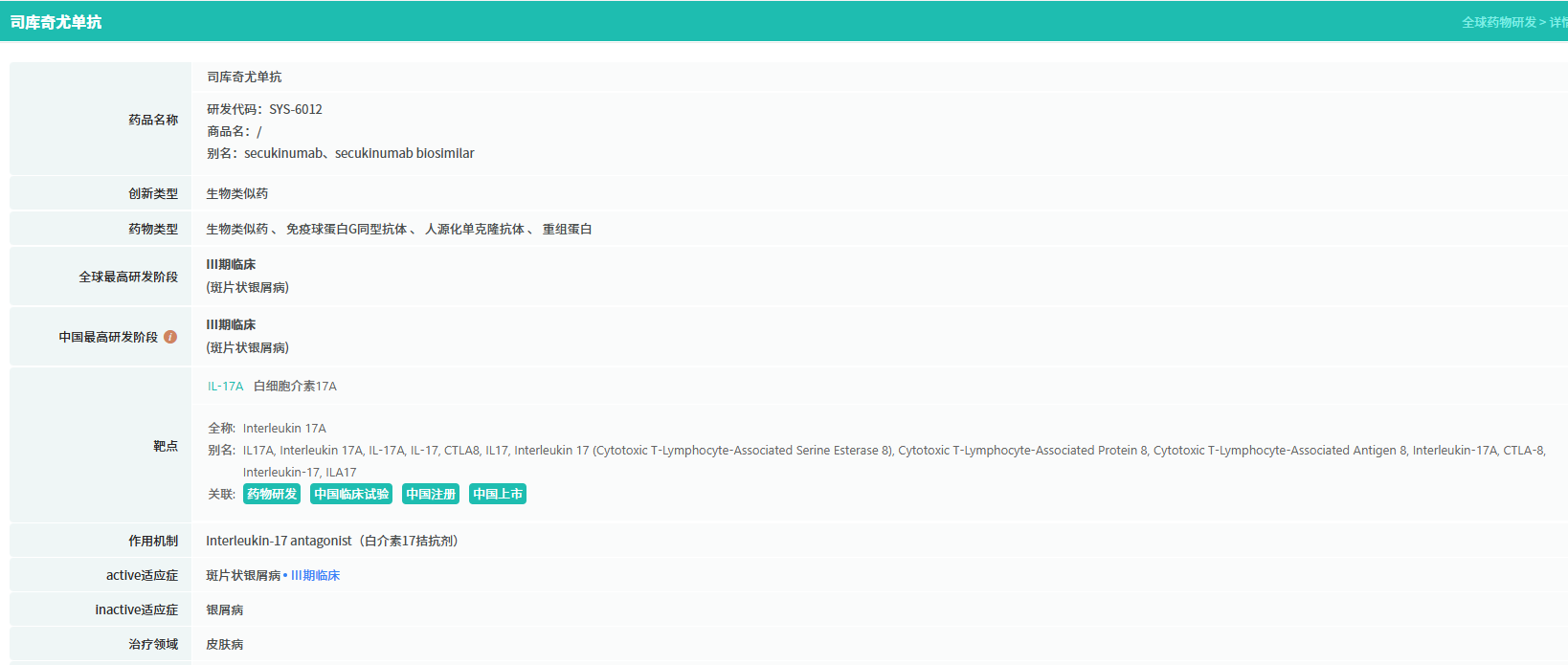 司库奇尤单抗可特异性结合IL-17A,阻断IL-17受体的信号传导,从而抑制银屑病炎症。原研药可善挺®已在中国获批上市,适应症包括6岁及以上斑块状银屑病、银屑病关节炎、强直性脊柱炎及化脓性汗腺炎,其疗效与安全性已获得广泛认可。