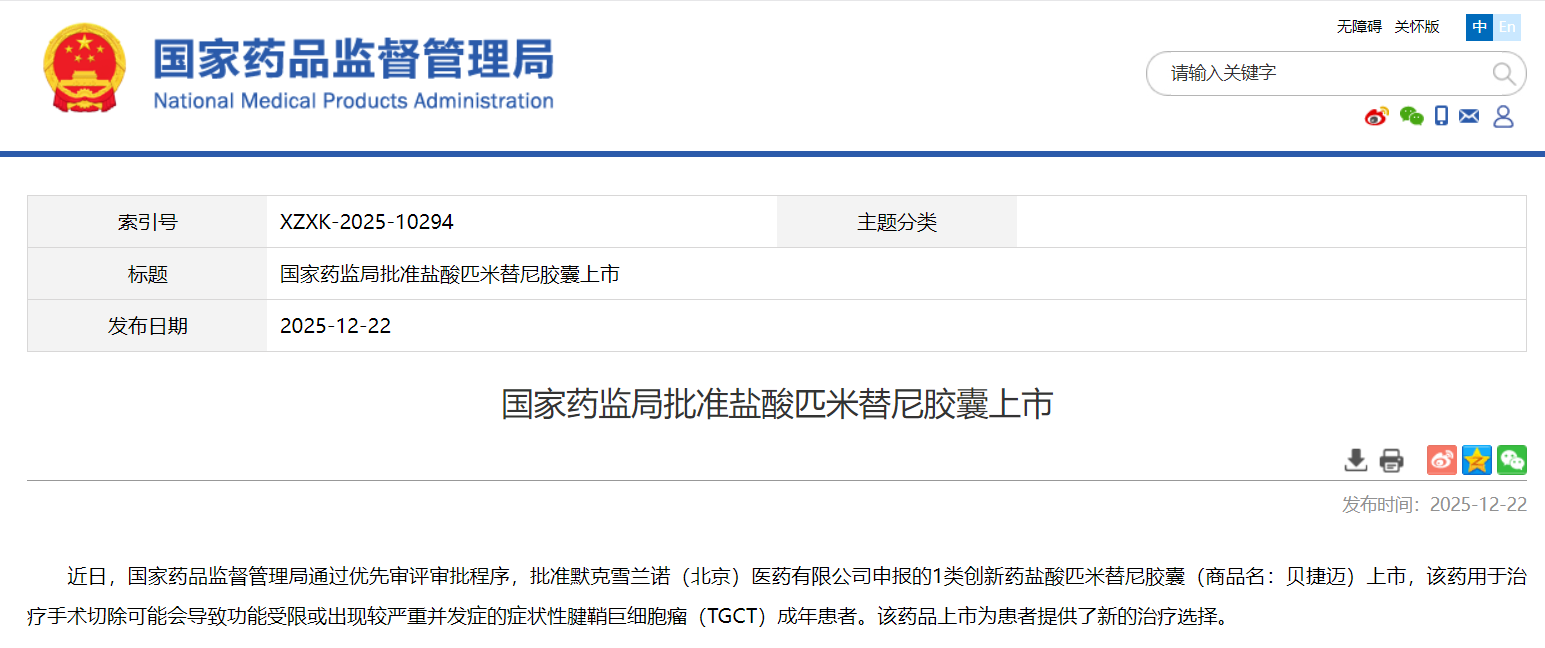 12月22日,据国家药监局发布公告,通过优先审评审批程序批准默克雪兰诺(北京)医药有限公司申报的1类创新药 盐酸匹米替尼胶囊(商品名:贝捷迈)上市,用于治疗手术切除可能会导致功能受限或出现较严重并发症的症状性腱鞘巨细胞瘤(TGCT)成年患者。