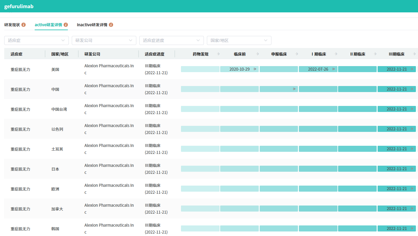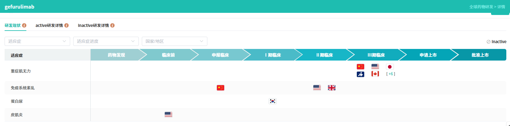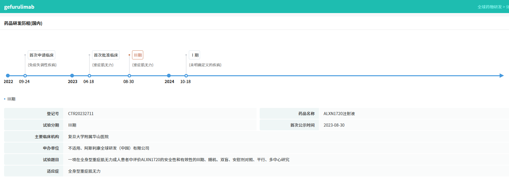 戈鲁利单抗的临床进展稳步推进:该药于2022年9月24日首次提交针对免疫失调性疾病的临床试验申请,随后在2023年4月18日获准开展重症肌无力适应症的临床研究,并于同年8月30日正式进入Ⅲ期临床试验阶段。