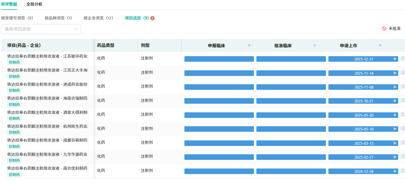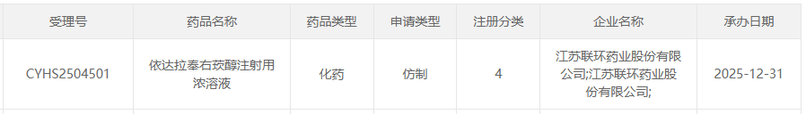 2025年12月31日,据国家药监局药品审评中心(CDE)官网显示,江苏联环药业提交的4类仿制药“依达拉奉右莰醇注射用浓溶液”上市申请已获受理。这是继2025年11月14日上海凯宝新谊(新乡)药业申报失败后,该品种迎来的最新入局者。