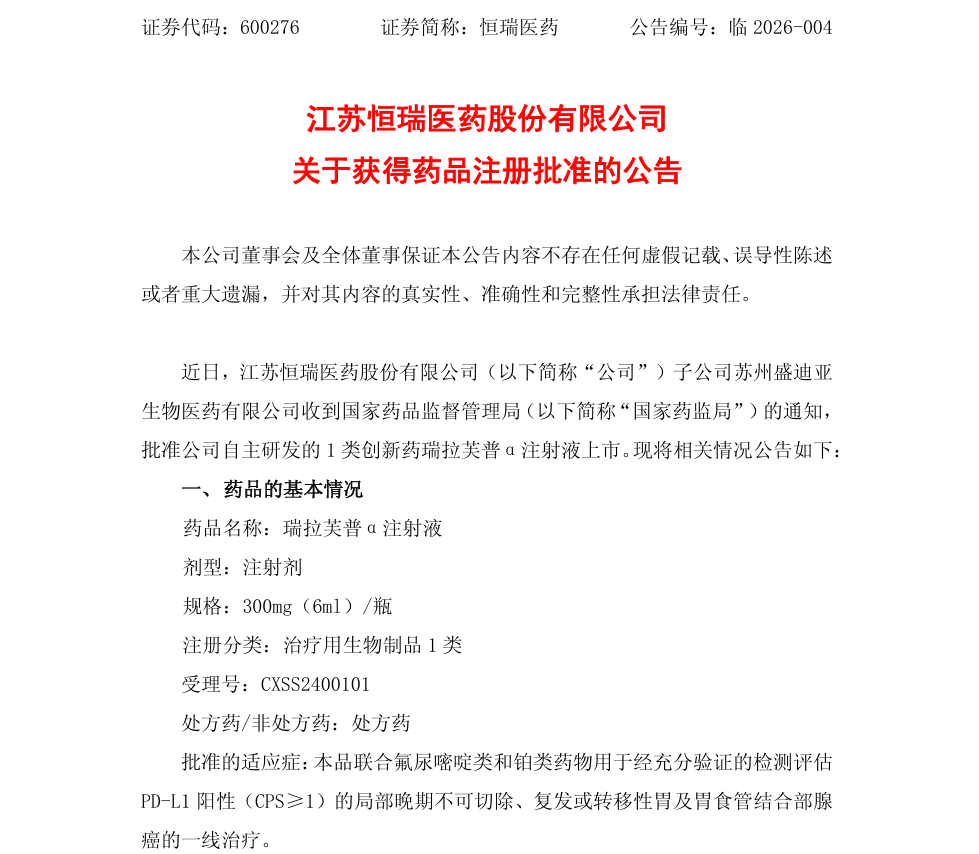 1月8日,恒瑞医药发布公告,其自主研发的1类创新药 瑞拉芙普α注射液(商品名:艾泽利®)获国家药监局批准上市。该药为全球首个PD‑L1/TGF‑β双靶点新药,获批适应症为联合氟尿嘧啶类和铂类药物,用于PD‑L1阳性(CPS≥1)的局部晚期不可切除、复发或转移性胃及胃食管结合部腺癌的一线治疗。