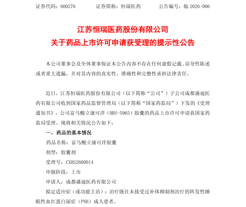 1月9日,恒瑞医药对外发布公告称,其自主研发的1类新药——富马酸立康可泮胶囊的药品上市许可申请已正式获得受理。此次申请的适应症为治疗既往未接受过补体抑制剂治疗的阵发性睡眠性血红蛋白尿症(PNH)成人患者,为PNH患者带来了新的治疗选择。