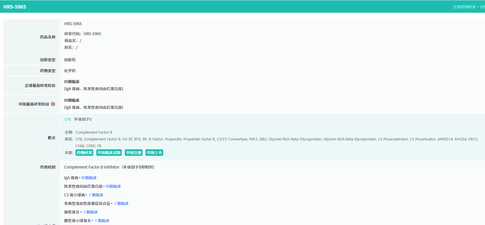 富马酸立康可泮胶囊是恒瑞医药自主研发的1类新药,其独特之处在于它是一款以补体活化系统旁路途径中的B因子(CFB)为靶点的口服小分子抑制剂。补体B因子抑制剂通过靶向因子B来抑制替代途径(AP),能够同时控制血管内溶血和血管外溶血,从而有效弥补了C5补体抑制剂在治疗上的不足。此外,该药物采用口服给药方式,大大提高了患者的用药依从性。