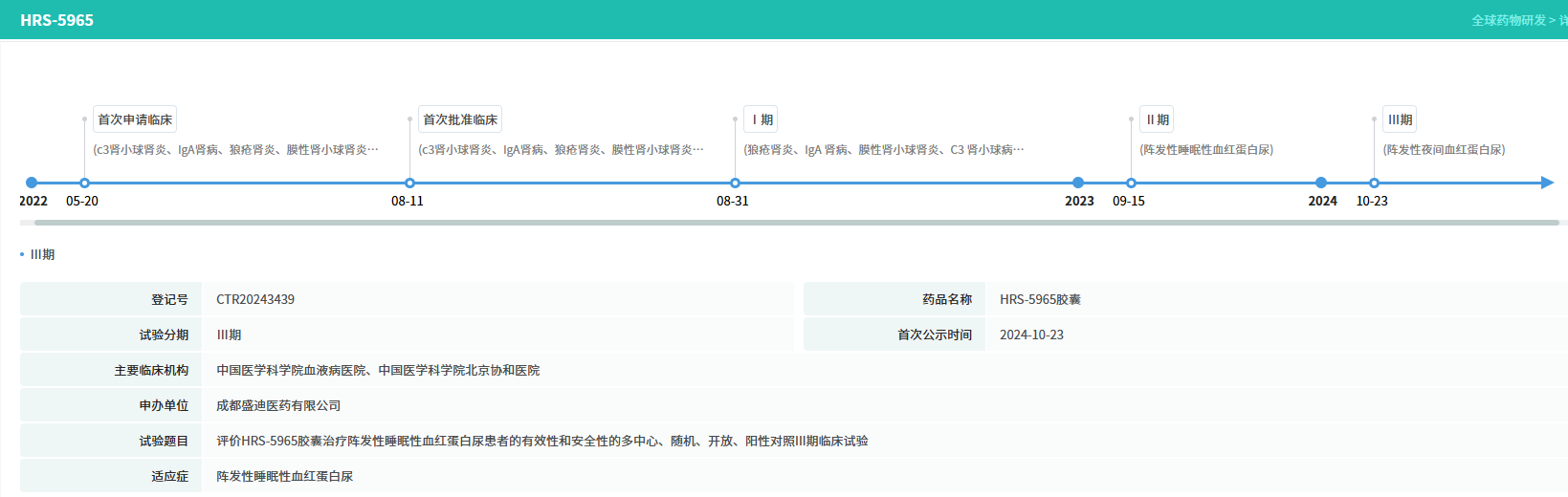 此次富马酸立康可泮胶囊的申报上市,是基于一项关键性的多中心、随机、开放、阳性对照III期临床试验。该试验旨在评价富马酸立康可泮胶囊(研发代号:HRS-5965)在既往未接受过补体抑制剂治疗的PNH患者中的有效性和安全性。