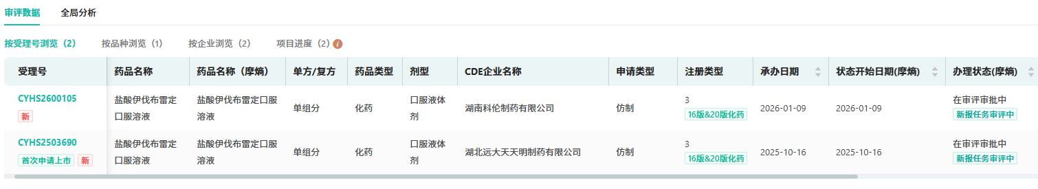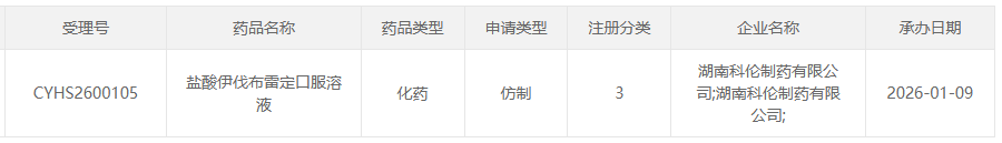2025年10月16日,远大医药全资子公司湖北远大天天明制药按化药3类提交的 盐酸伊伐布雷定口服溶液 上市申请获得受理。不到三个月,2026年1月9日,湖南科伦制药也提交了同一品种的上市申请,成为第2家入局的企业。