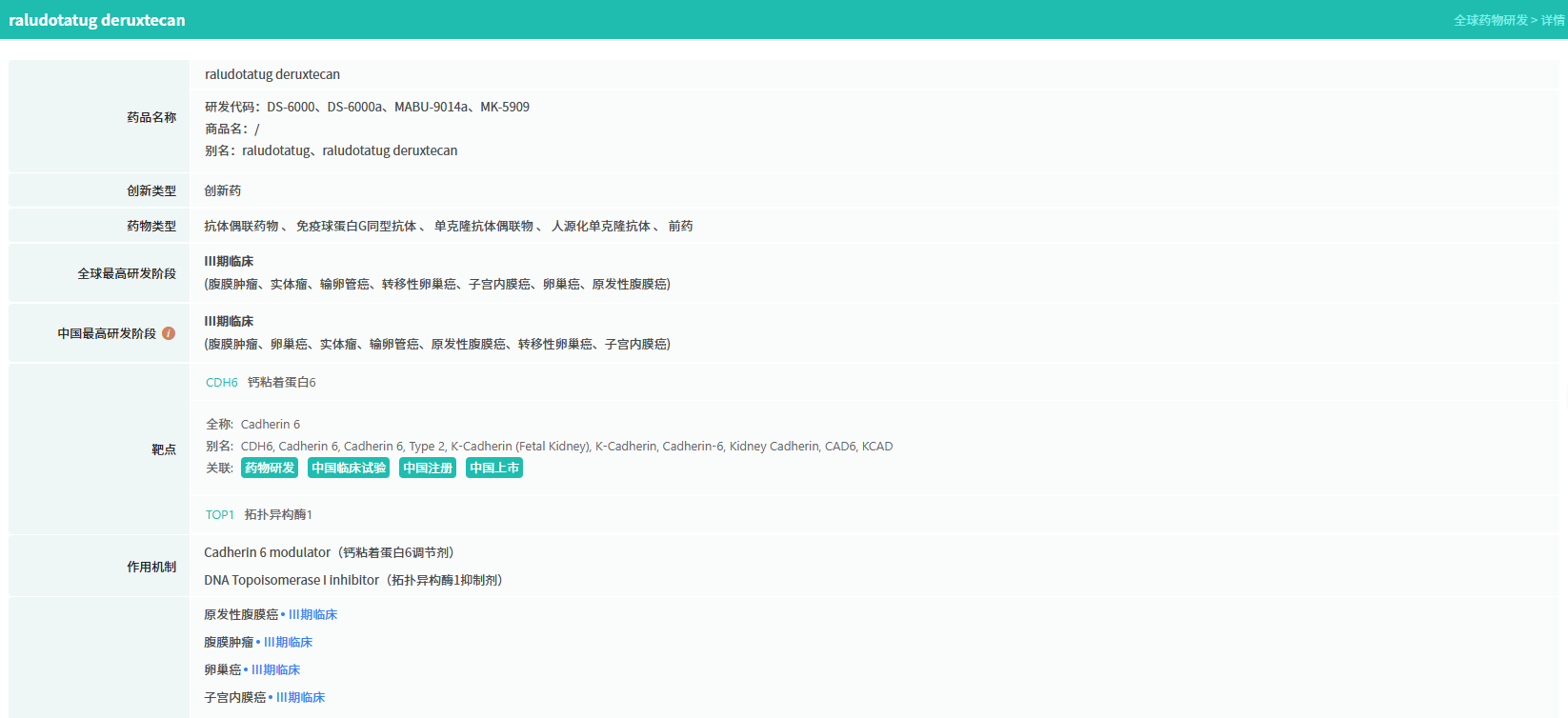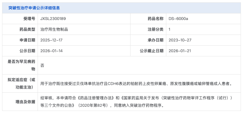 1月14日,据CDE最新显示,第一三共与默沙东联合开发的靶向CDH6抗体偶联药物 DS-6000a(Raludotatug deruxtecan)拟纳入突破性治疗品种,剑指铂耐药卵巢癌等难治性肿瘤。这款全球进展最快的CDH6靶向ADC药物,正以“肿瘤定向炸弹”的姿态冲击临床治疗格局。