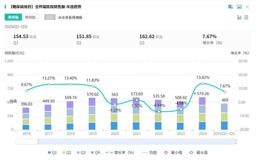 糖尿病用药市场向来是兵家必争之地。据摩熵医药数据库显示,2024年全终端医院市场糖尿病用药(化药+生物药)销售额超570亿元,2025年前三季度已达460亿元,同比增长7.67%。如此庞大的市场中,创新药与仿制药的竞争早已白热化,而 奥洛格列净 作为东阳光药首款1类降糖新药,无疑为其抢滩市场注入强心剂。