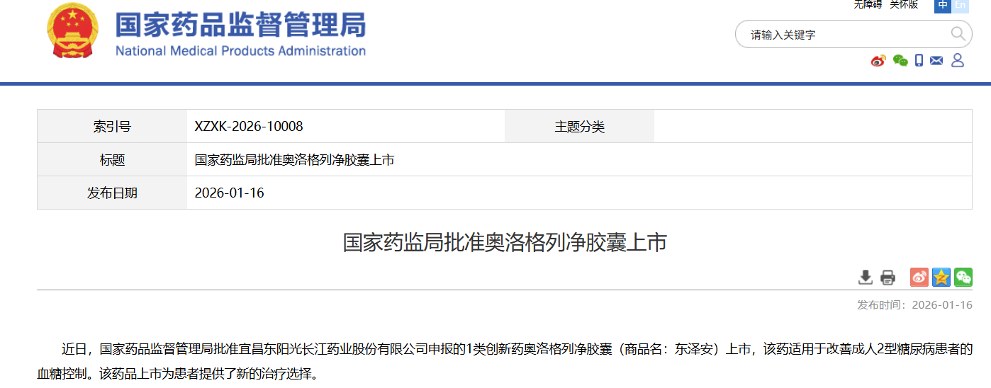1月16日,国家药监局(NMPA)官网显示,东阳光药申报的1类新药 奥洛格列净胶囊 获批上市,适用于改善成人2型糖尿病患者的血糖控制。作为东阳光药首款降糖创新药,奥洛格列净 的上市不仅填补了公司在糖尿病核心治疗领域的空白,更直指百亿级市场蛋糕。