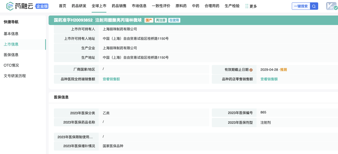 截止本公告披露日,国内共有两家企业持有醋酸亮丙瑞林长效缓释制剂生产批文(不含原研),仅上海丽珠制药有限公司通过一致性评价。国内醋酸亮丙瑞林长效缓释制剂2023年终端销售金额约为人民币46.60亿元。