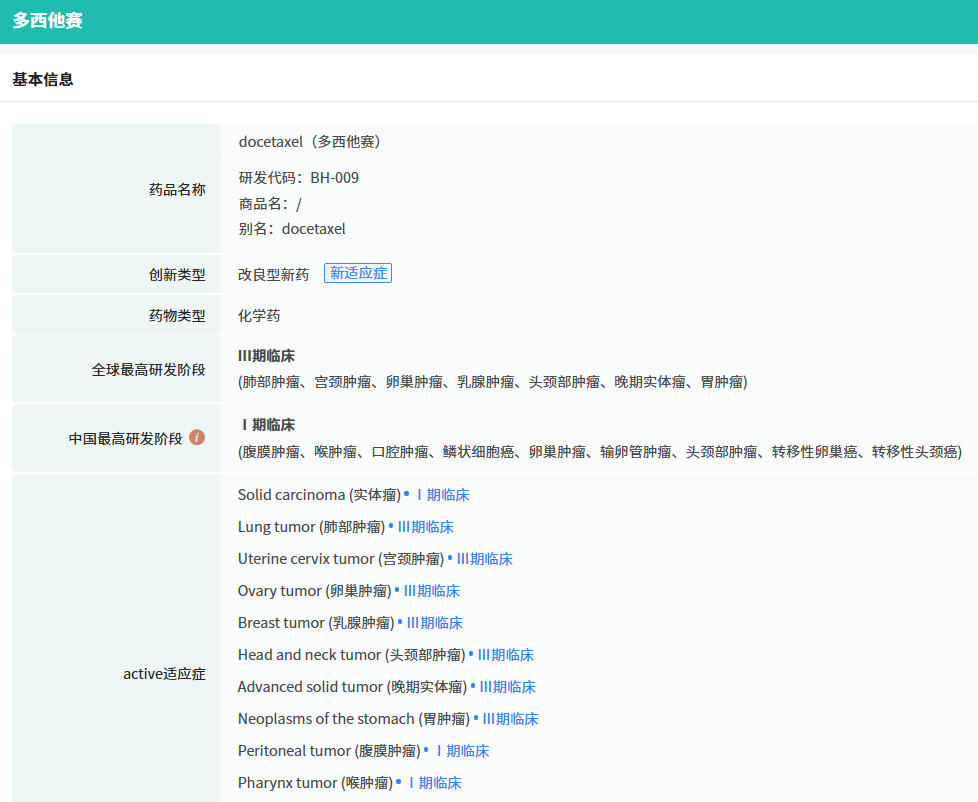 据摩熵医药(原药融云)数据库显示,多西他赛作为一种抗肿瘤药物,在临床上广泛使用,用于治疗乳腺癌、非小细胞肺癌、前列腺癌、胃癌、头颈部鳞癌等常见实体瘤。据贝海生物新闻稿介绍,现有的多西他赛产品均含有吐温80(一种非离子表面活性剂及乳化剂),在临床使用过程中吐温80会产生严重过敏反应、体液潴留等严重毒副作用。BEIZRAY制剂中完全不含有吐温80,消除了吐温80所致的严重过敏反应,显著改善了药物临床使用安全性。