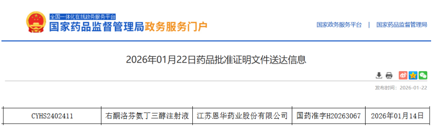 1月22日,国家药监局(NMPA)官网显示,江苏恩华药业按化药3类申报的 右酮洛芬氨丁三醇注射液 获批上市,并视同通过一致性评价。至此,国内该品种过评企业增至两家——2023年5月南京正科医药拿下首仿后,恩华药业此次获批成为国内第二家,进一步点燃解热镇痛注射液的国产替代战火。