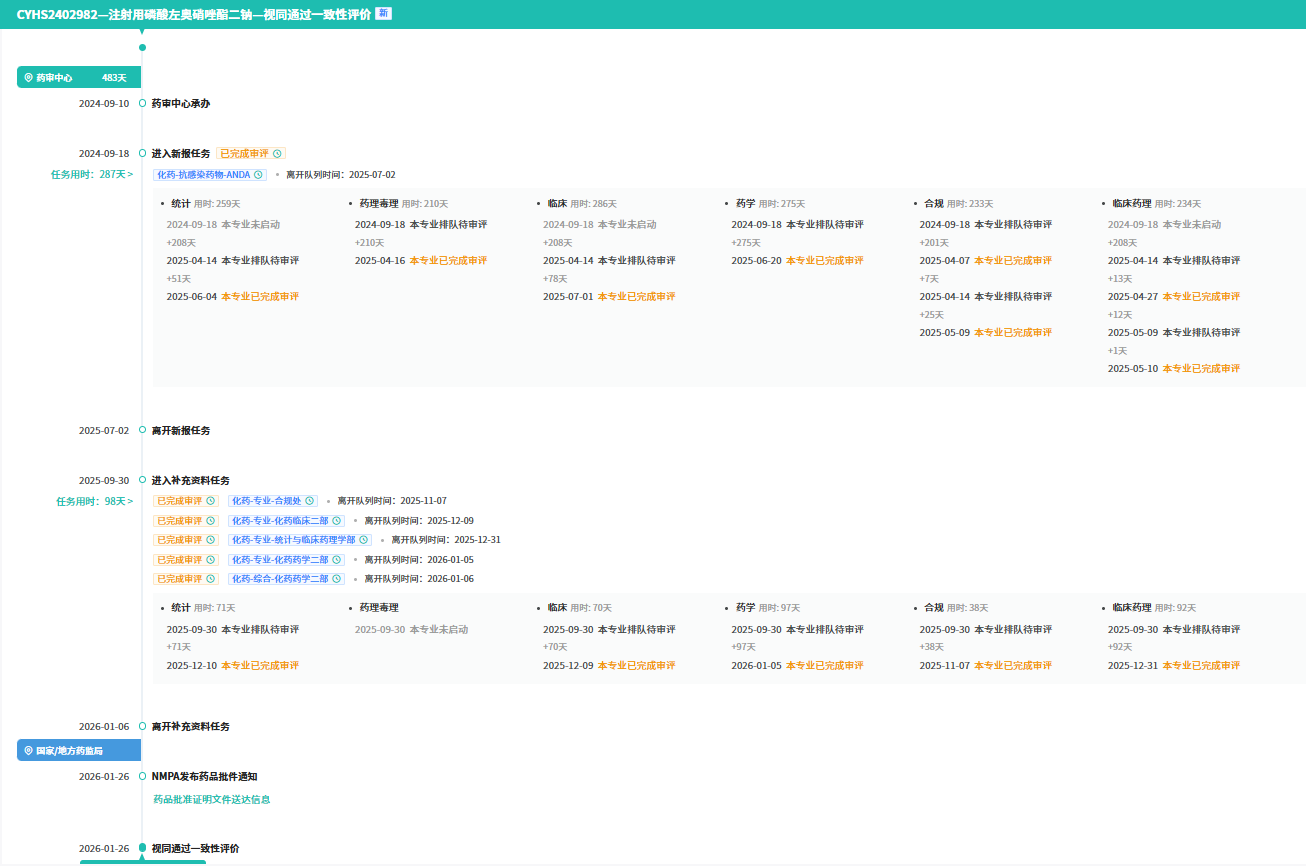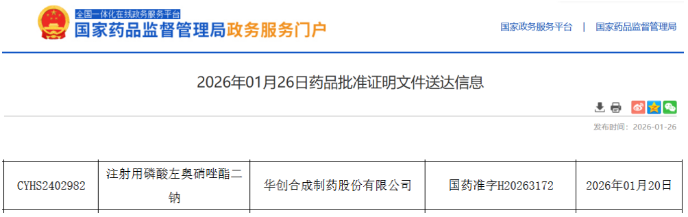 1月26日,国家药监局(NMPA)官网挂出的批件显示,华创合成制药按4类仿制药申请的 注射用磷酸左奥硝唑酯二钠 正式获批上市,并通过一致性评价。该品种原为扬子江药业集团2021年获批的化药1类创新药,并已纳入国家医保谈判目录。此次华创合成拿下国内首仿,标志着这一“亿级”国谈大品种正式进入原研+仿制并存的竞争阶段,打破扬子江药业的独家市场身份。