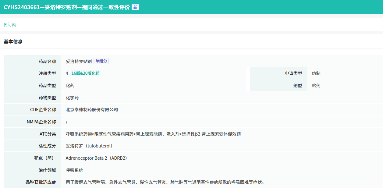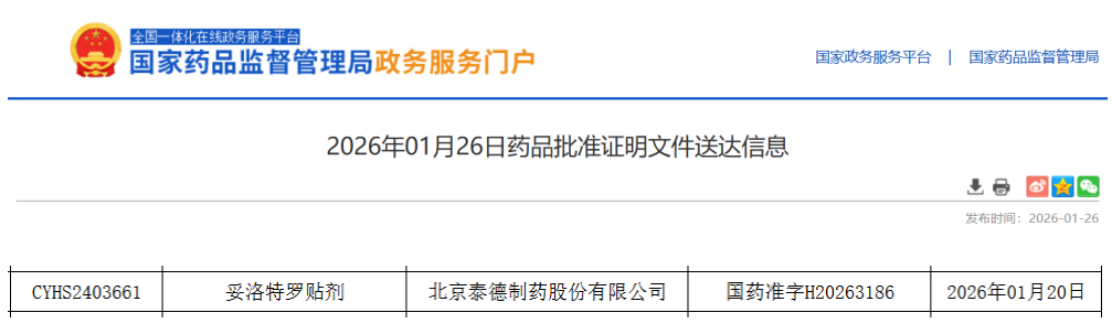 2026年1月26日,国家药品监督管理局(NMPA)批准了 中国生物制药 旗下 北京泰德制药股份有限公司 的 妥洛特罗贴剂(商品名:德瑞妥®)0.5mg/贴儿童小规格。