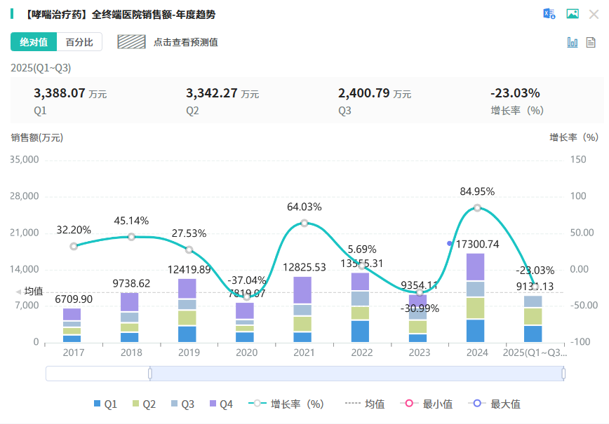根据 摩熵医药数据库 显示,哮喘治疗中成药物在2024年全终端院内市场销售总额超1亿元,同比增长达84.95%。近年来儿童呼吸系统疾病已成为家长关注的重点健康问题,其中喘息是最为常见的呼吸道症状之一。数据显示,约1/3的儿童在3岁前会出现喘息症状,到6岁时这一比例接近50%。