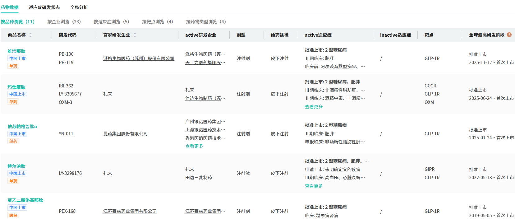 国内方面,摩熵医药数据库显示,目前已有11款GLP-1R激动剂获批上市,除礼来的 替尔泊肽 与信达的 玛仕度肽 外,其余均为单靶点药物。先为达的 埃诺格鲁肽 凭借独特的cAMP偏向型机制与长效特性,有望在竞争白热化的红海中开辟差异化赛道,抢占增量市场。