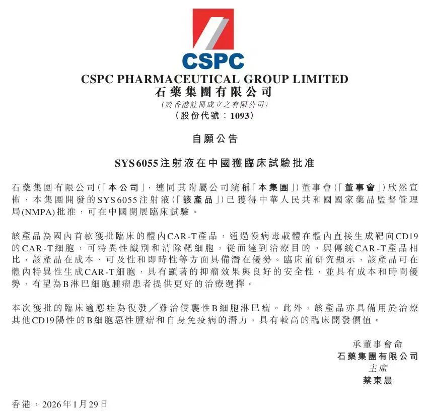 1月29日,石药集团(01093)发布公告,公司的 SYS6055注射液 已获得中华人民共和国国家药品监督管理局(NMPA)批准,可以在中国开展临床试验。该产品为国内首款获批临床的体内CAR-T产品,具有通过慢病毒载体在体内直接生成靶向CD19的CAR-T细胞的能力,能够特异性识别和清除靶细胞,进而达到治疗目的。