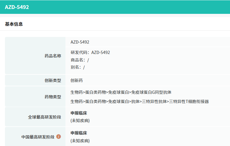 2024年8月14日AZD5492在中国申报临床,它是一种不对称三特异性IgG1抗体,含两抗CD20 Fab结构域、一TCR结合VHH结构域和一CD8共受体结合VHH结构域。抗CD20抗体常用于B细胞疾病治疗。