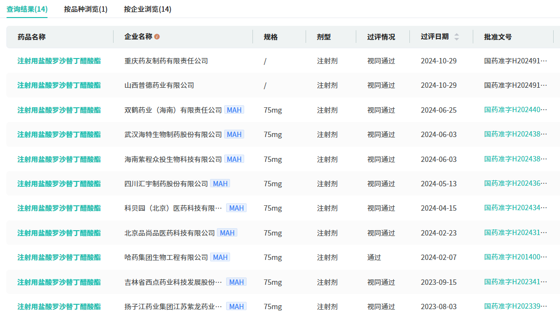 10月29日,据NMPA官网最新公示 ,重庆药友制药和山西普德药业2家药企提交的3类仿制药注射用盐酸罗沙替丁醋酸酯同日获批。至此,该品种已形成14+1家企业的竞争格局,市场竞争愈发白热化。