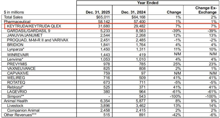 2025年财报,默沙东PD-1抗体 Keytruda(K药)的全年销售额达到316.8亿美元。第四季度,静脉注射Keytruda 及其近期获批的皮下制剂 Keytruda Qlex 的销售额总计接近84亿美元,同比增长7%。