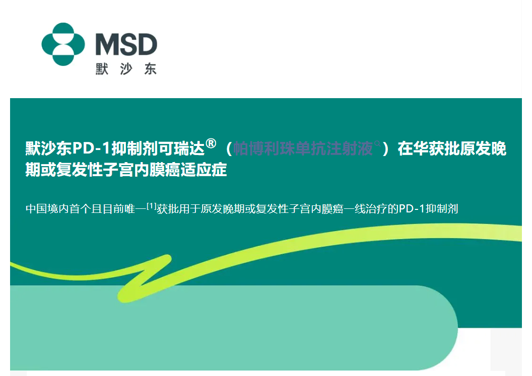 默沙东全球高级副总裁、默沙东中国总裁唐凯宇表示:我们非常高兴可瑞达®成为中国境内获批的首个用于晚期或复发性子宫内膜癌一线治疗的PD-1抑制剂。子宫内膜癌是一种给女性健康带来沉重负担的疾病,尤其是在疾病晚期,患者长期面临治疗选择有限、预后不佳的问题,中位生存期仅为12-15个月。此次获批是中国女性肿瘤治疗领域的重要里程碑,也是帕博利珠单抗在中国获批的第20项适应症。