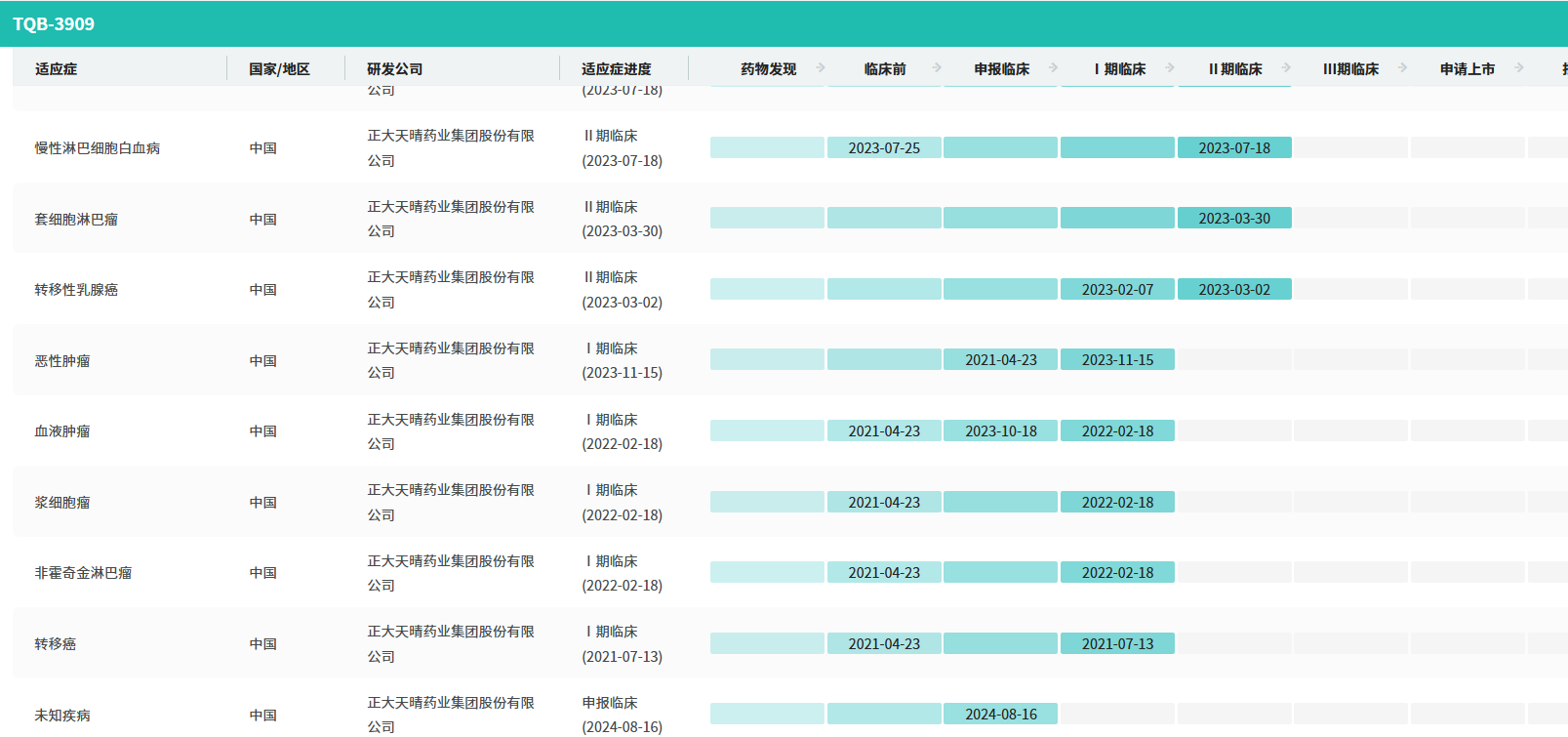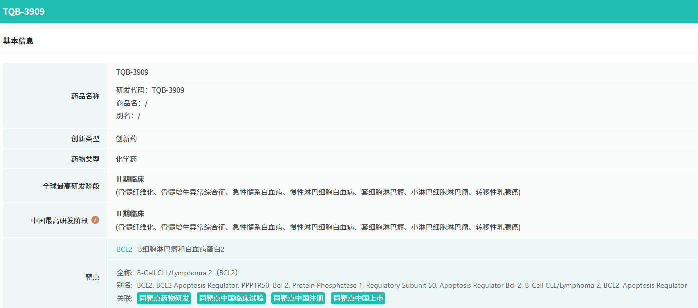 根据中国药物临床试验登记与信息公示平台官网,有近十项TQB3909相关的临床研究正在开展,其中联合JAK抑制剂TQ05105片用于治疗中高危骨髓纤维化、联合阿扎胞苷治疗髓系恶性肿瘤、单药治疗复发或难治性CLL/SLL、单药治疗复发或难治性套细胞淋巴瘤(MCL)等均已经进入1/2期临床研究阶段。