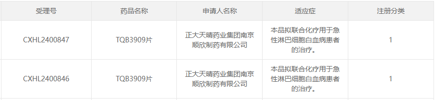 10月29日,据CDE官网公示,正大天晴申报的1类新药TQB3909片获批两项新的临床试验默示许可,拟联合化疗用于急性淋巴细胞白血病(ALL)患者的治疗。