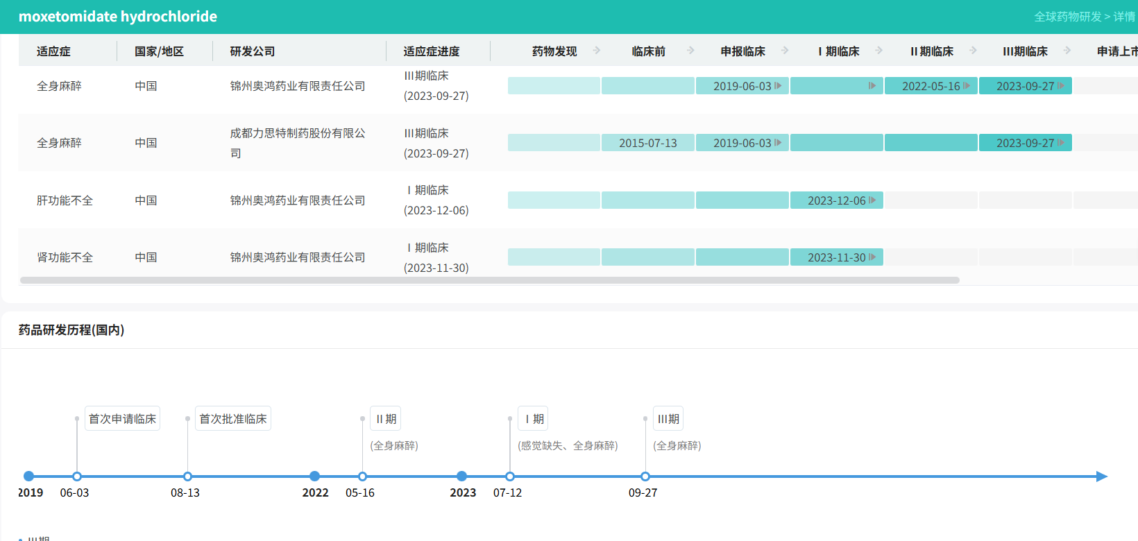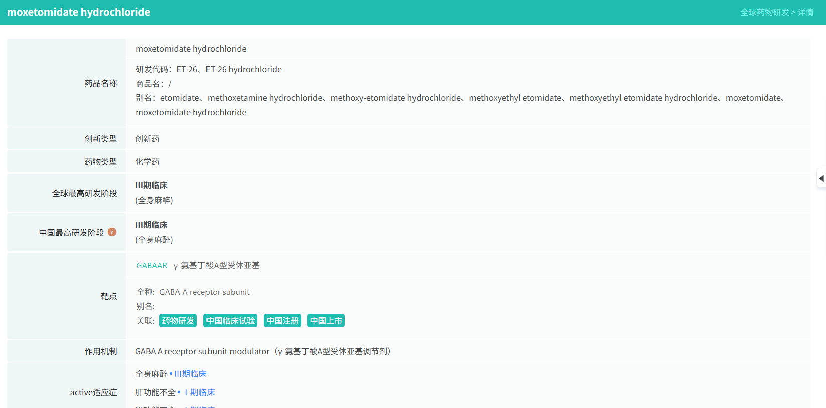 据摩熵医药数据库显示,盐酸莫托咪酯注射液 属于咪唑类改构的静脉全身麻醉1类新药,具有独特的创新性和先进性。早在2014年,它便凭借其潜在的临床价值和科学意义,被列入重大新药创制科技重大专项,得到了国家层面的重点支持和关注。这一专项的入选,不仅是对该药物研发价值的高度认可,也为其后续的研发进程提供了有力的政策保障和资源支持。
