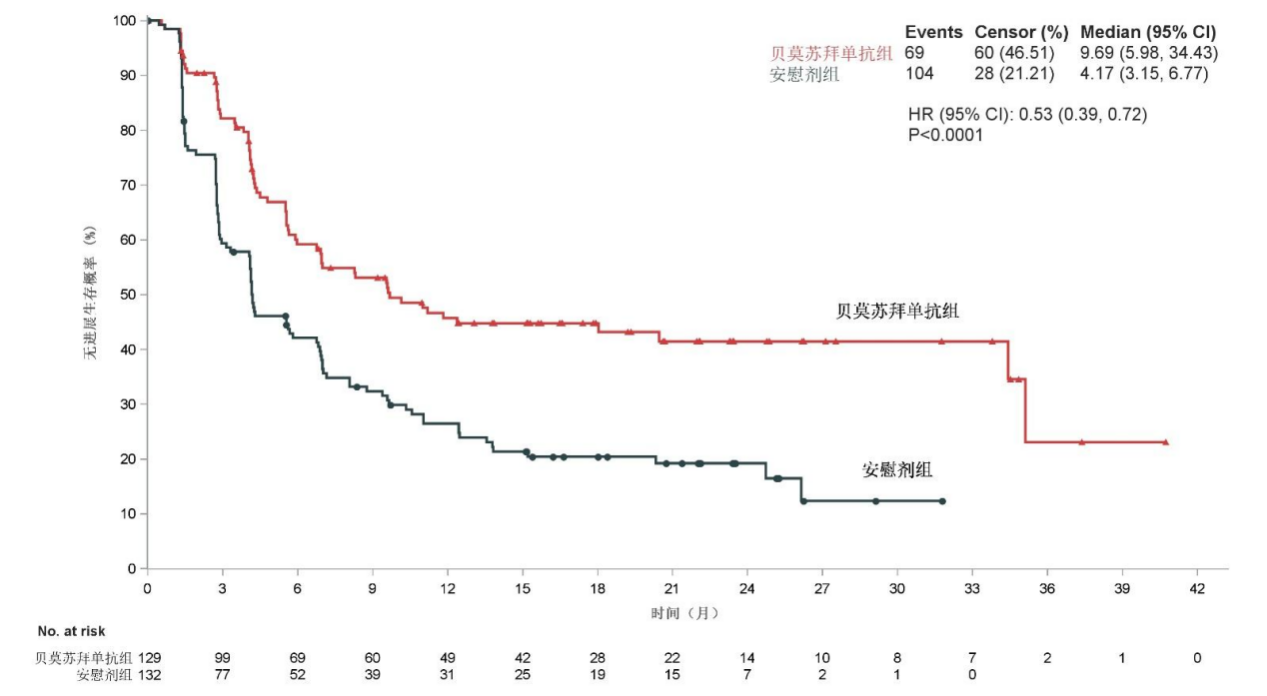 此次新适应症的获批,得益于R - ALPS研究取得的令人瞩目的阳性结果。该研究聚焦于同步/序贯放化疗后病情未进展的局部晚期/不可切除的Ⅲ期非小细胞肺癌(NSCLC)患者。在研究过程中,129例患者接受 贝莫苏拜单抗 巩固治疗,132例患者则接受安慰剂治疗直至疾病出现进展。研究设定的主要终点是由盲态独立中心审查(BICR)评估的无进展生存期(PFS)。