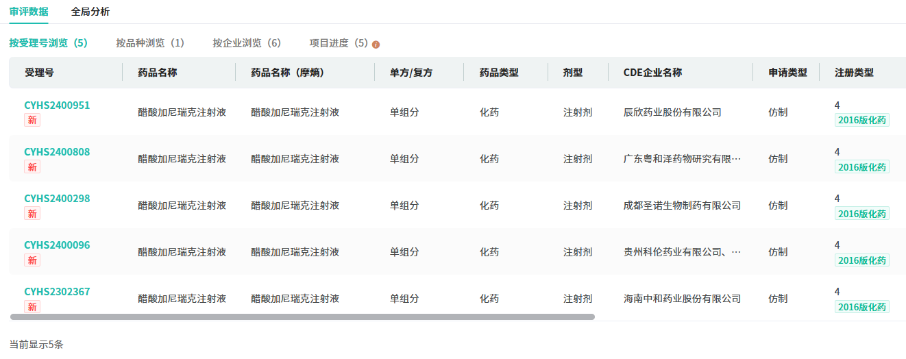 除原研(欧加农),国内市场还有正大天晴、南京康舟医药、深圳翰宇药业、齐鲁制药4家药企的醋酸加尼瑞克注射液已获批上市,扬子江药业集团江苏紫龙药业为该产品国产第5家。