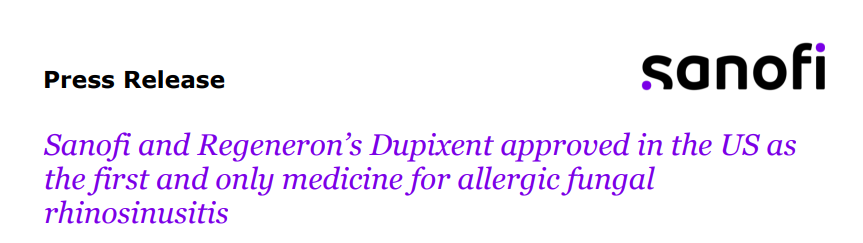 2月24日,一则来自大洋彼岸的消息,再次夯实了 度普利尤单抗(Dupixent)在自免领域的“王者”地位。赛诺菲 与 再生元 联合宣布,美国FDA正式批准其重磅药物 度普利尤单抗 用于治疗有鼻窦手术史的成人及6岁以上儿童变应性真菌性鼻窦炎(AFRS)患者。