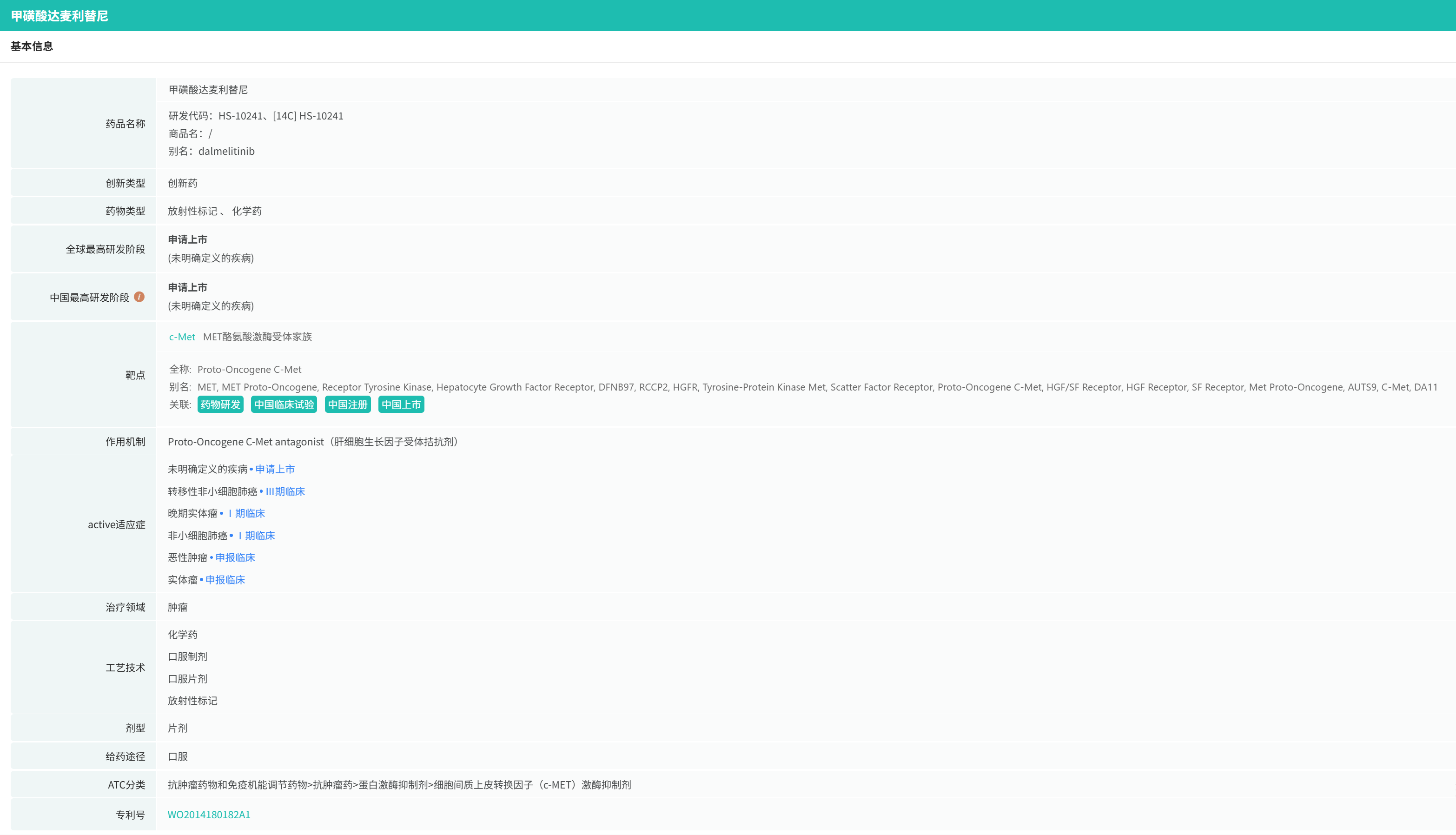 根据公开资料及摩熵医药数据库显示,这款药物是翰森在c-MET抑制剂领域的重要布局,其关键Ⅲ期临床研究已完成——HS-10241联合甲磺酸阿美替尼片,对比含铂双药化疗,用于经表皮生长因子受体酪氨酸激酶抑制剂(EGFR-TKI)治疗失败、伴间质-上皮转化因子(MET)扩增的晚期非小细胞肺癌(NSCLC)患者。