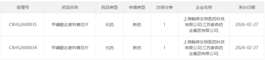 2月27日,据CDE官网显示,翰森制药自主研发的1类新药 甲磺酸达麦利替尼片(研发代码:HS-10241)上市申请获受理,具体适应症尚未披露。