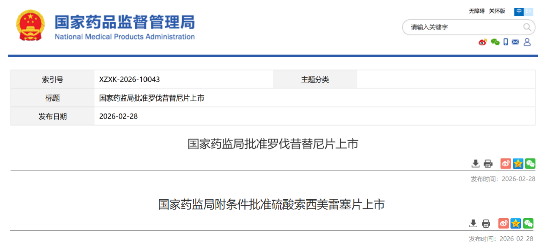 2月28日,国家药监局官网连发两道批件,为国产创新药再添浓墨重彩的一笔:正大天晴药业的 罗伐昔替尼片(全球首创JAK/ROCK双靶点抑制剂)与浙江杭煜制药(济民可信子公司)的 硫酸索西美雷塞片(KRAS G12C抑制剂)同日获批上市。一款剑指骨髓纤维化,一款攻坚晚期肺癌,中国创新药正以“双箭齐发”之势,填补临床空白。