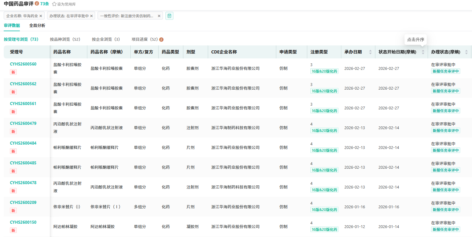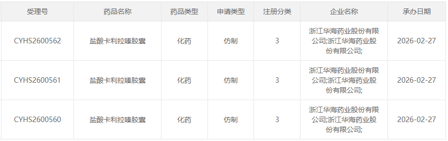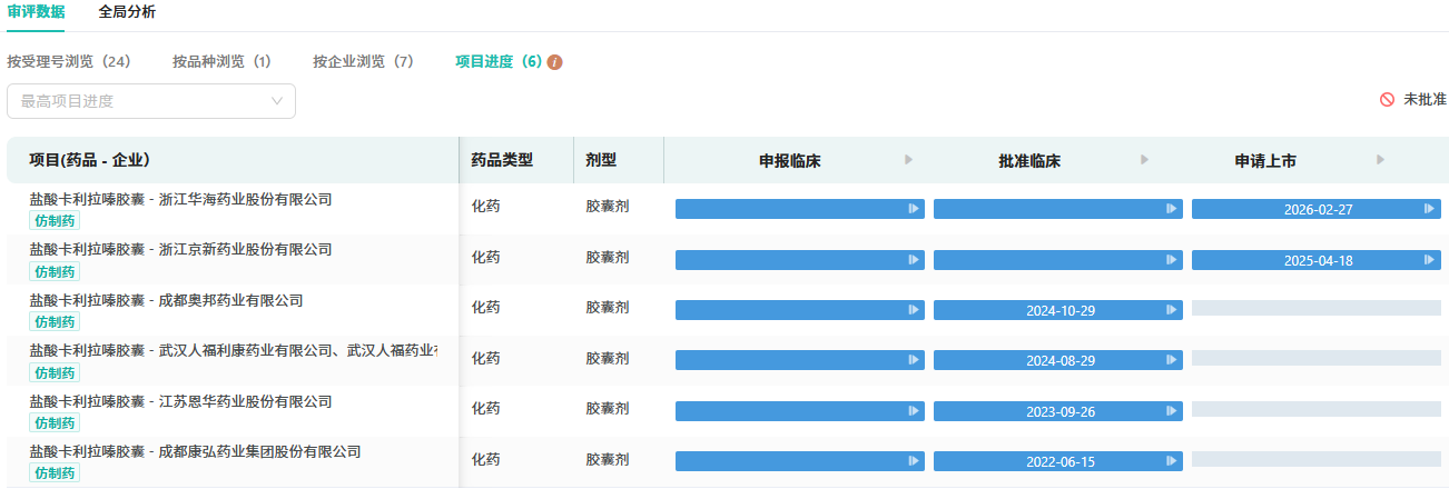 随着华海的强势介入,国内 盐酸卡利拉嗪胶囊 的仿制赛道竞争已逐步白热化,形成了清晰的梯队格局。目前,京新药业的同品种上市申请已处于审评阶段,占据着宝贵的时间优势;华海药业虽受理在后,但综合实力不容小觑。两家头部企业正围绕“国内首仿”这一至高荣誉展开直接竞争,成败在此一举。