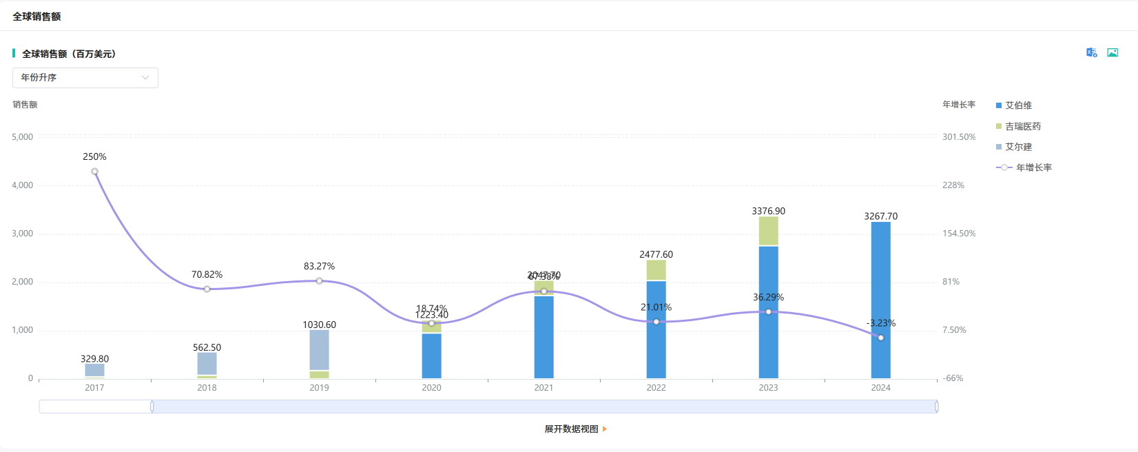 盐酸卡利拉嗪胶囊(商品名:Vraylar),原研来自艾伯维。该药是一款专注于治疗成人精神分裂症的中枢神经系统(CNS)重磅药物。自2015年在美国首获批准上市后,该产品于2017年7月进一步拓展至欧盟市场,全球商业化步伐稳步推进。作为CNS领域的“印钞机”,Vraylar在全球市场表现极为强劲——摩熵医药数据库显示,其2023年全球销售额近34亿美元,2024年销售额更是逼近33亿美元(约合人民币240亿元)。