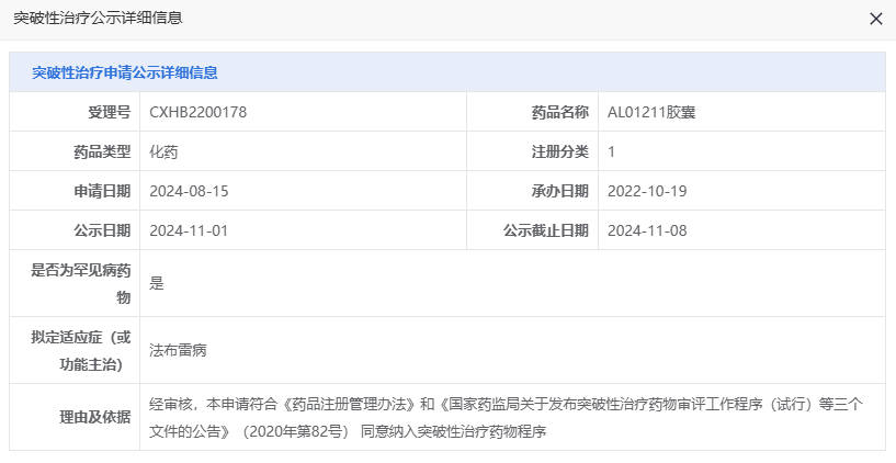 11月1日,据CDE官网显示,艾司林科(Acelink Therapeutics)的罕见病药物AL01211胶囊拟纳入突破性疗法,适应症为法布雷病。