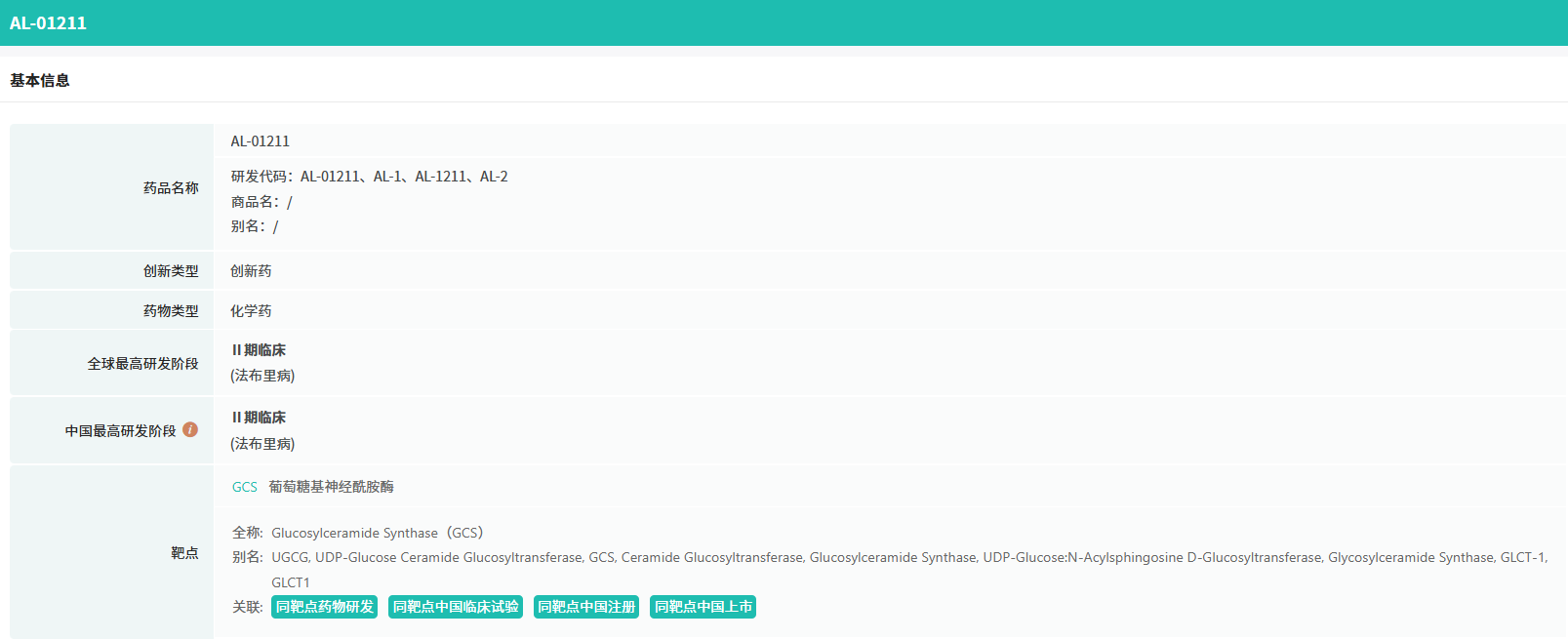 AL01211是一款新型选择性口服葡萄糖神经酰胺合酶(GCS)抑制剂,与目前已批准或正在开发的其他 GCS 抑制剂相比,效力更强,在GCS酶测定中IC50(半抑制浓度)为7nM,活性显著优于其它在研的GCS抑制剂。