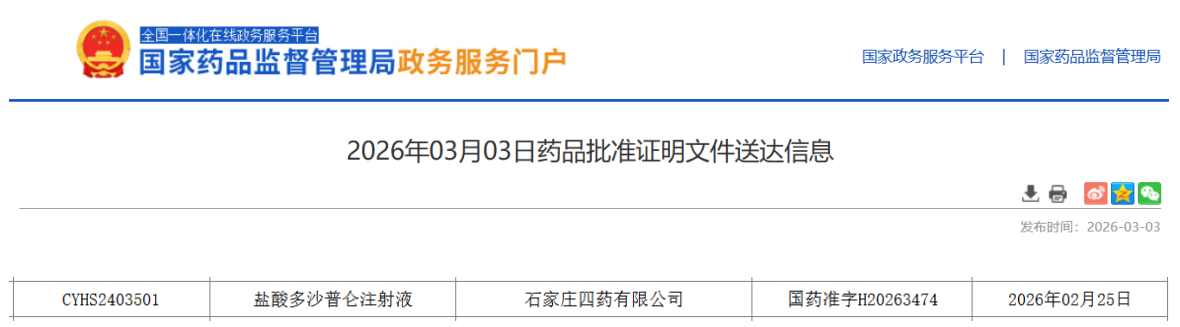 2026年以来,石家庄四药已先后获批 培哚普利氨氯地平片(Ⅲ)、复合磷酸氢钾注射液(2ml)、盐酸普罗帕酮注射液(20ml∶70mg)、盐酸多沙普仑注射液(5ml:100mg)4个制剂新产品。其中,盐酸多沙普仑注射液 为首家过评,盐酸普罗帕酮注射液 则为国内第3家获批。