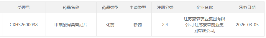 3月5日,根据国家药监局药审中心(CDE)官网公示,江苏豪森 的 甲磺酸阿美替尼片 上市申请获得受理。上周(2月27日),翰森制药的新药 达麦利替尼 的上市申请也获得受理。