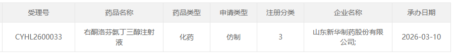 3月10日,据CDE官网显示,山东新华制药提交的3类仿制药右酮洛芬氨丁三醇注射液的上市申请获受理。目前,该品种仅有2家药企成功获批并过评,若山东新华制药此次能顺利突围,将有望斩获国产第3家。